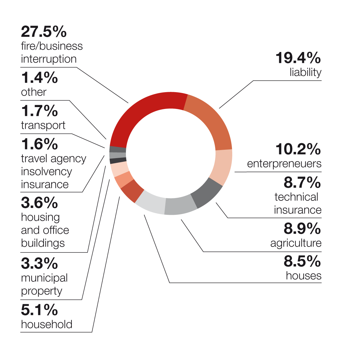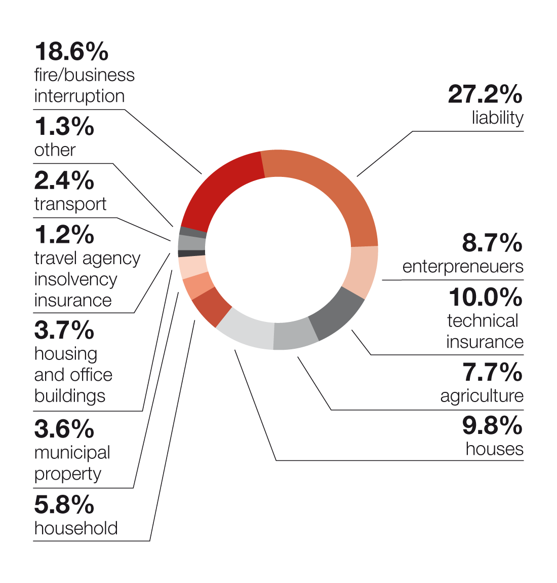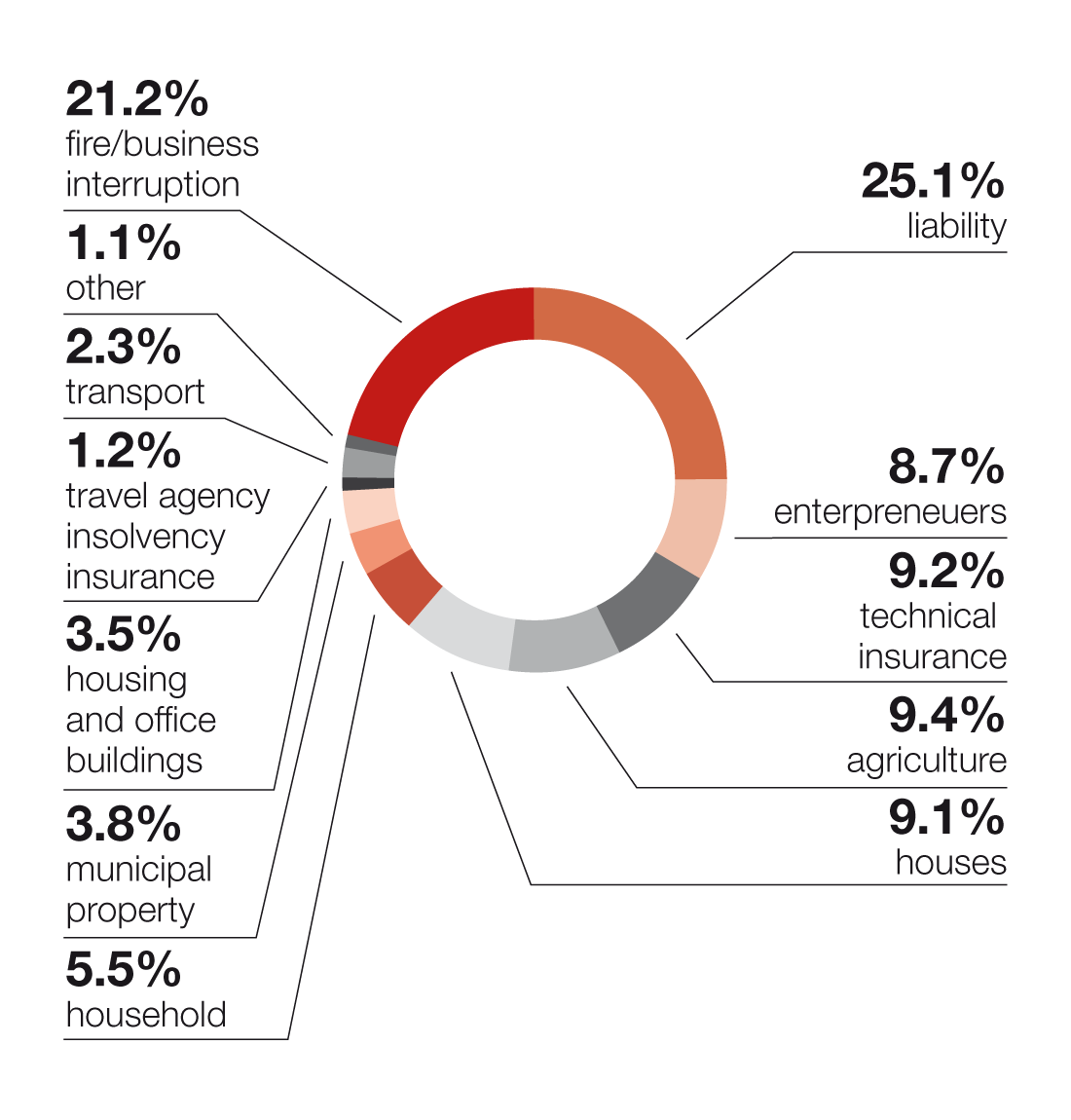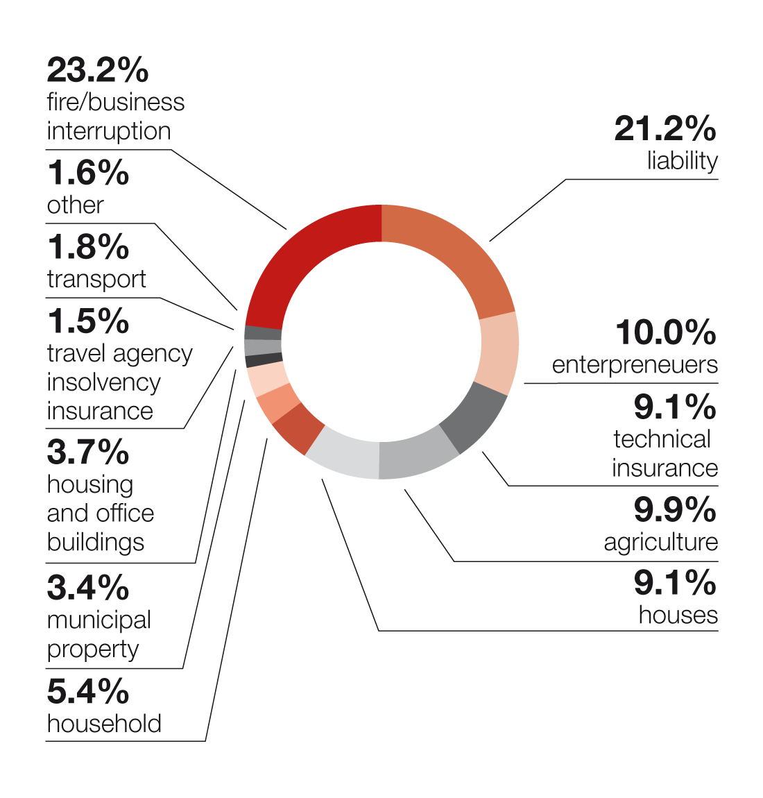 | Fire/business interruption | 523.7 | 21.0% | 597.4 | 23.2% | 743.8 | 27.5% |