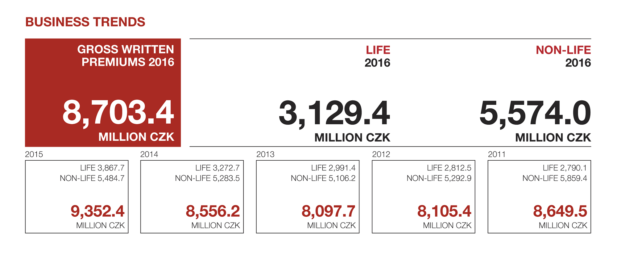 As at 31 December 2016, Generali was managing more than 1,599,778 insurance contracts. Gross written premiums totalled CZK 8,703.4 million, down from CZK 9,352.4 million in the previous year. Life insurance written premiums came to CZK 3,129.4 million. Overall non-life insurance billing climbed to CZK 5,574 million.